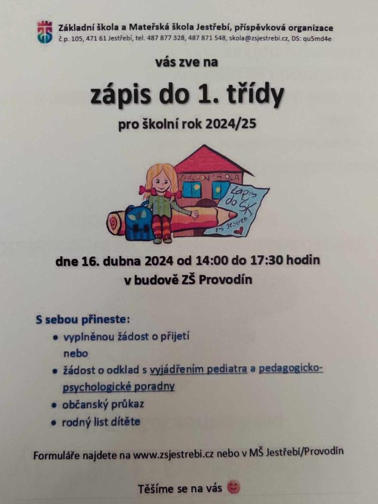 Zápis do 1. třídy pro školní rok 2024/25 - ZŠ a MŠ Jestřebí